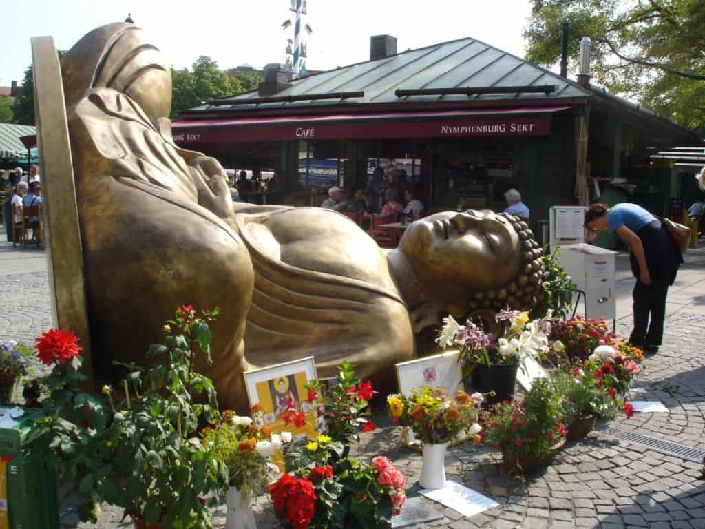 Der in London lebende Künstler, der selbst Buddhist ist, hat eine im Lotussitz sitzende und bewusst auf den Rücken gelegte Buddha-Statue geschaffen auf deren Unterseite „Made in Dresden“ eingraviert ist. Damit wollte er die „Internationalisierung und Globalisierung an einem typisch Münchnerischen Ort und einer touristischen Sehenswürdigkeit“ thematisieren. Die Kunst-Installation war bis Ende September 2013 auf dem Viktualienmarkt zu sehen.