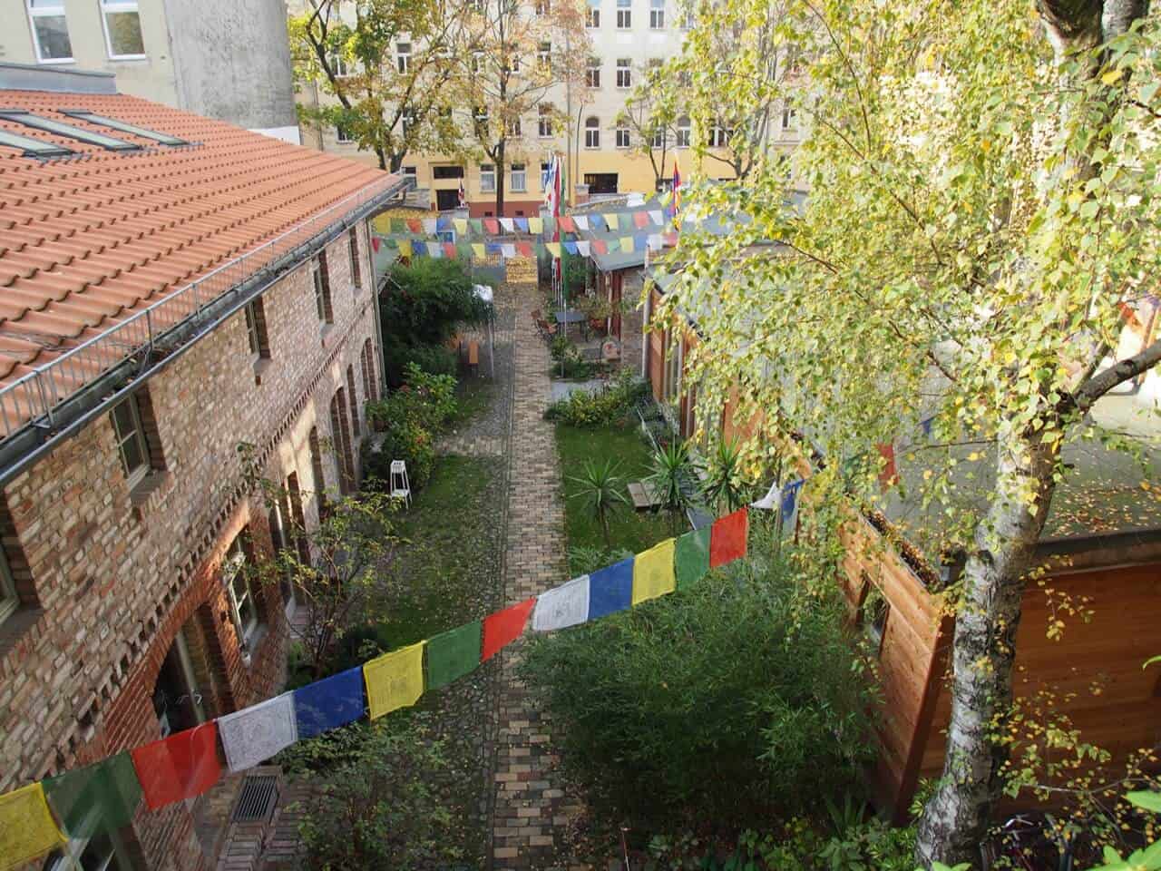 Durch die Gartenanlage ist eine grüne Oase zur Erholung entstanden. Ein besonderer Ort ist darin der 6 m hohe Stupa, ein sakrales Monument von vielfältiger symbolischer Bedeutung.