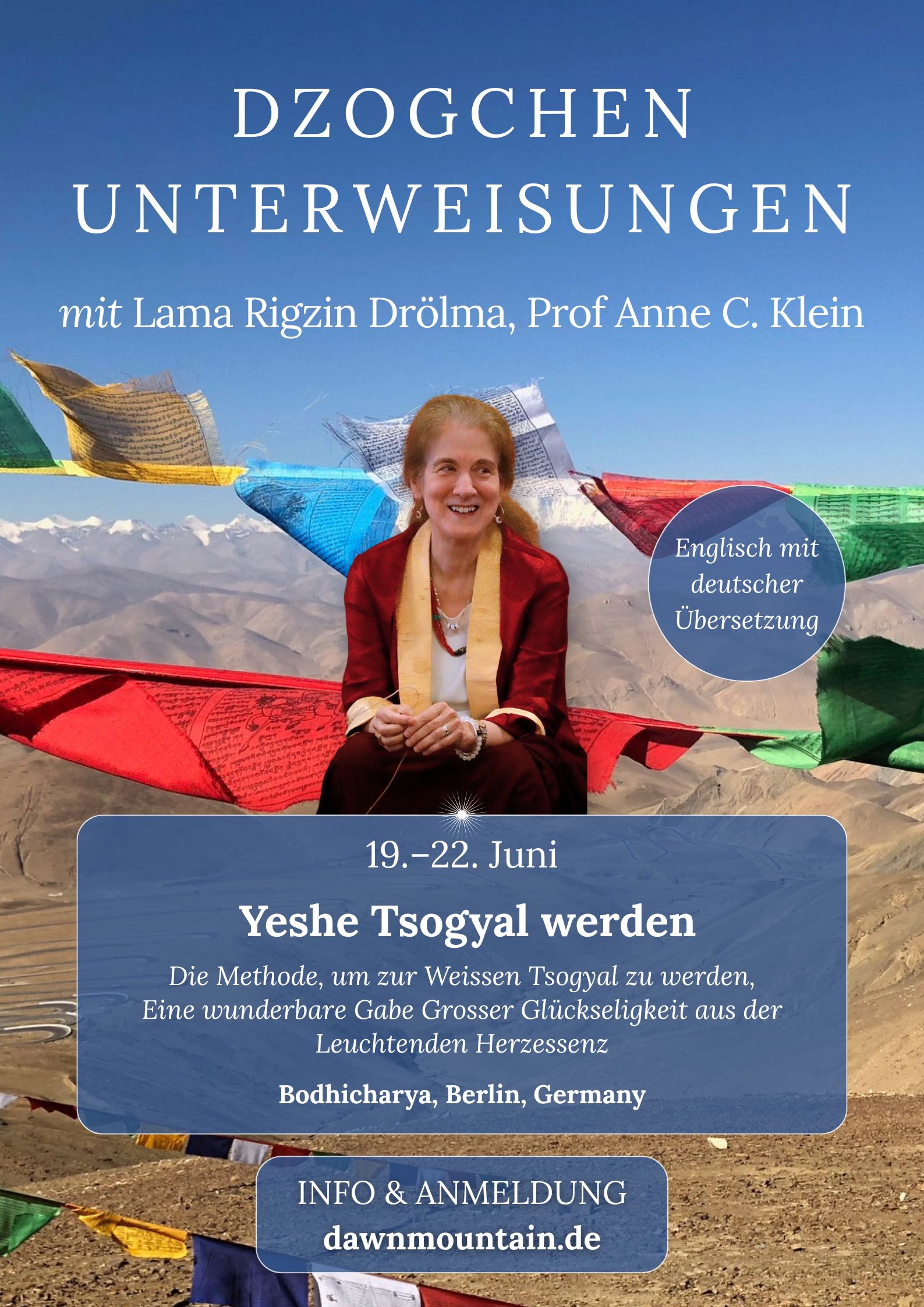 Lama Rigzin Drolma ist eine der engsten westlichen Schülerinnen von A.dzom Paylo Rinpoche, einem großen Dzogchen-Meister unserer Zeit, der erst vor wenigen Jahren das einzigartige Terma Dakini Ngöndro offenbart hat. Die Übertragungslinie ist so nah, dass wir buchstäblich den frischen Atem der Dakinis in Form der vielen Segnungen spüren können.