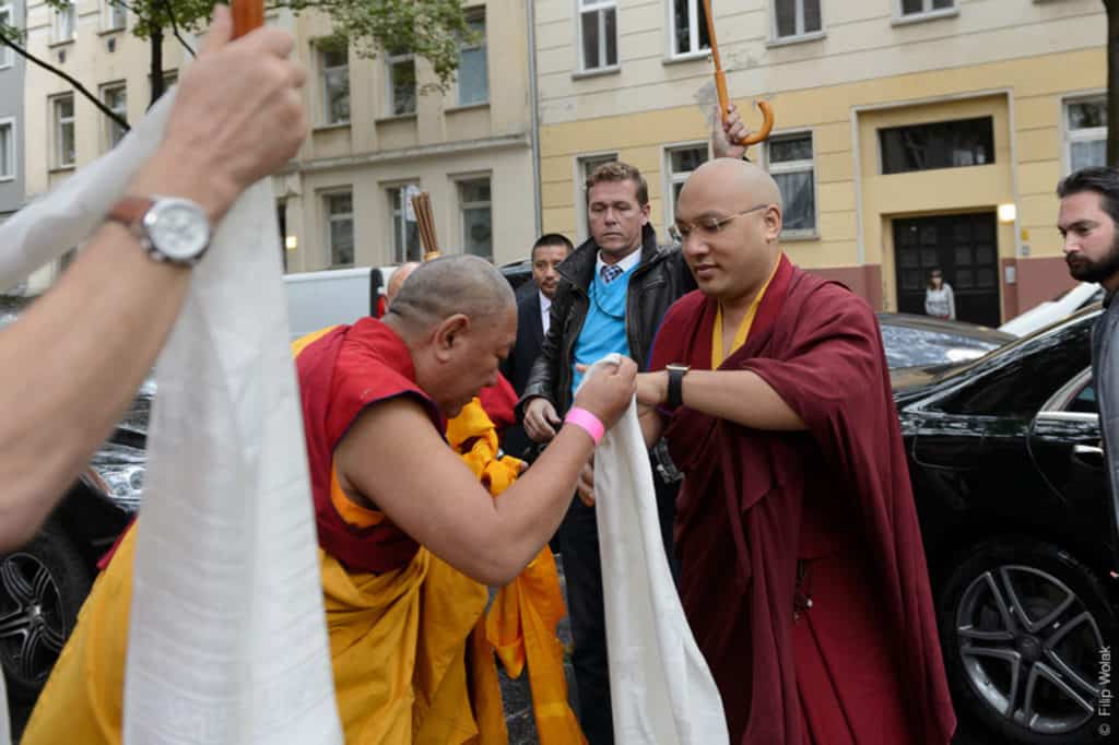 Mehr als 350 Personen, einschließlich Vertreter der verschiedenen Bodhicharya-Zentren Europas, Mitglieder und Unterstützer des Berliner Zentrums, sowie geladene Gäste, drängten sich im Haupttempel, um den 17. Karmapa zu seinem letzten öffentlichen Auftritt auf der zweiten Europareise zu empfangen. Der entfernte Klang einer tibetischen Gyalin verkündete seine Ankunft im Zentrum. Seine Heiligkeit wurde am Tor des Zentrums von dessen Gründer, Ringu Tulku Rinpoche, in Empfang genommen, der ihn anschließend auf dem Weg aus Ziegeln über das Gelände führte, wobei ihnen ein Junge und ein Mädchen Blütenblätter streuend vorangingen. Nachdem er einen Baum im Garten angepflanzt hatte, betrat Seine Heiligkeit den Tempelraum.