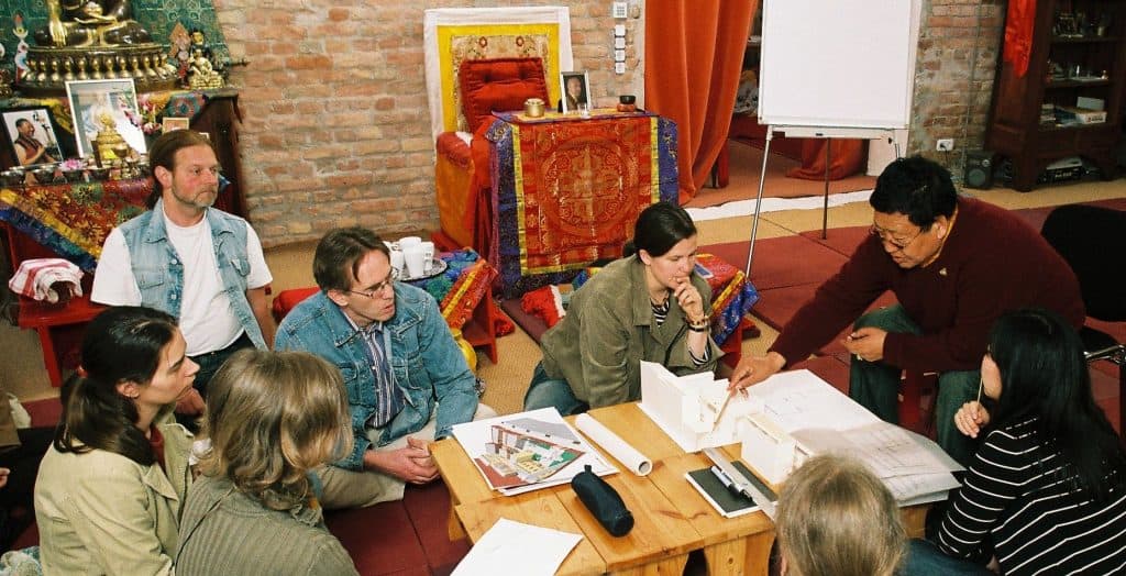 (Foto oben: Bei einer Bausitzung in 2007 gab er viele konkrete Hinweise. Foto rechts: Im Meditationsraum bei Bodhicharya in 2007)